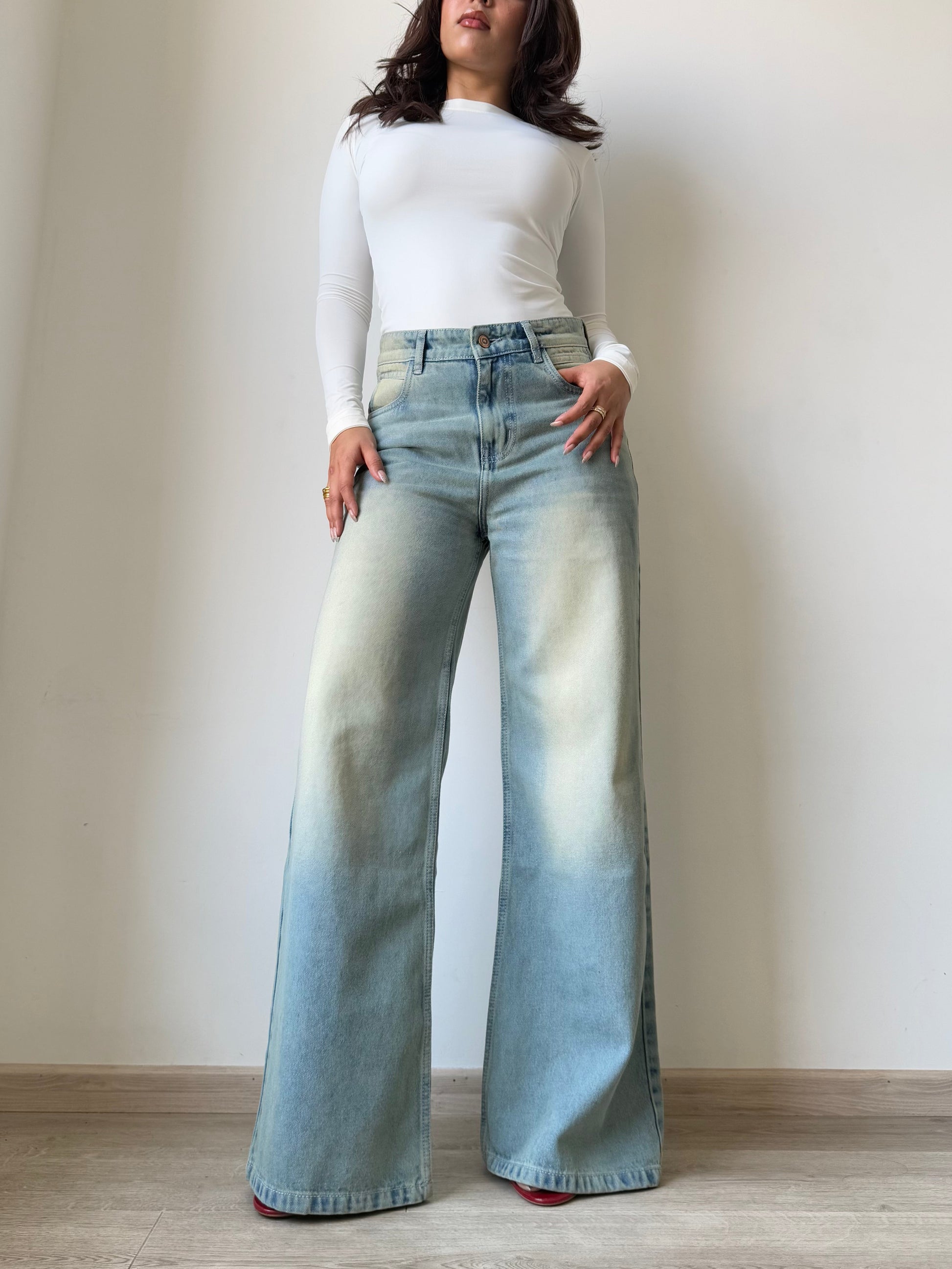 Enhance your wardrobe with our Blue Vintage Yellow Tinted Wide Leg Jeans. Made with a flattering wide leg fit, these jeans offer both style and comfort. The unique yellow tint adds a vintage touch while the blue colour remains timeless. Upgrade your denim game with these expertly crafted jeans.